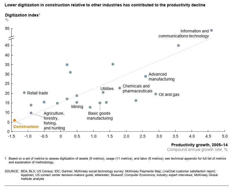 The Good News: Because the baseline is so low, the potential for improvement is massive. Digitization can reduce construction costs by up to 15% and reduce project schedules by 30%.